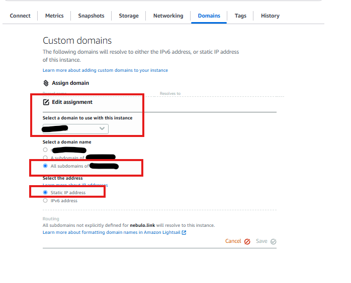 인스턴스 -> Domains 가서 순서대로 설정해주면 된다 하고 하단의 Save 누르기