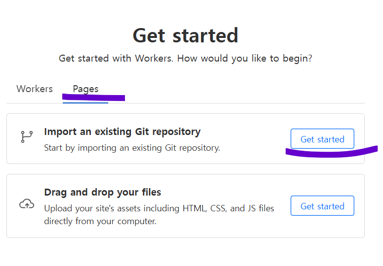 Account home -> Developer platform -> Create application 클릭 -> Pages -< import an ~ 어쩌고 클릭(Get started) ->